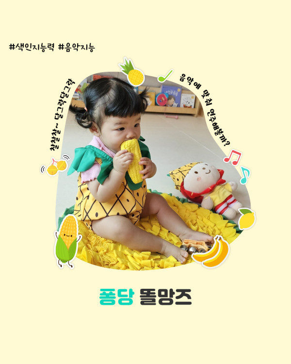 [똘망베베 후기] 노랑 악기로 연주해요 2025-12-12 0 99 2025.12.12 10:42 이번 #똘망베베 수업은 '색깔'을 주제로 한 감각 놀이였어요! 파인애플 의상을 입고 노랑 꽃밭에 앉아, 노랑 물체들을 바구니에 모으고 악기처럼 흔들며 리듬에 맞춰 연주까지! 아이는 놀이 속에서 노랑이라는 색을 인지하고 리듬감과 음악적 표현능력까지 키웠답니다.