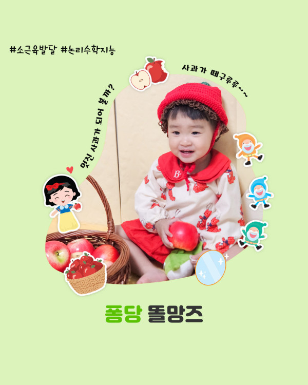 [똘망베베 후기] 사과가 떼구루루~ 2025-11-07 0 148 11.07 11:22 #똘망즈 백설공주 사과놀이 이번 #똘망베베 수업은 '사과'를 주제로 한 이야기놀이였어요! 백설공주 이야기 속 사과가 되어보며 색깔을 구분하고, 숫자를 세고, 나무에 사과 자리를 배치하고 규칙을 지키는 과정 속에서 논리력과 수학적 사고, 공간 감각이 자연스럽게 발달했어요. 나만의 사과가 되어보며 놀이 속에서 배우고, 생각하고, 웃으며 자연스럽게 배움과 즐거움을 동시에 경험해요.✨